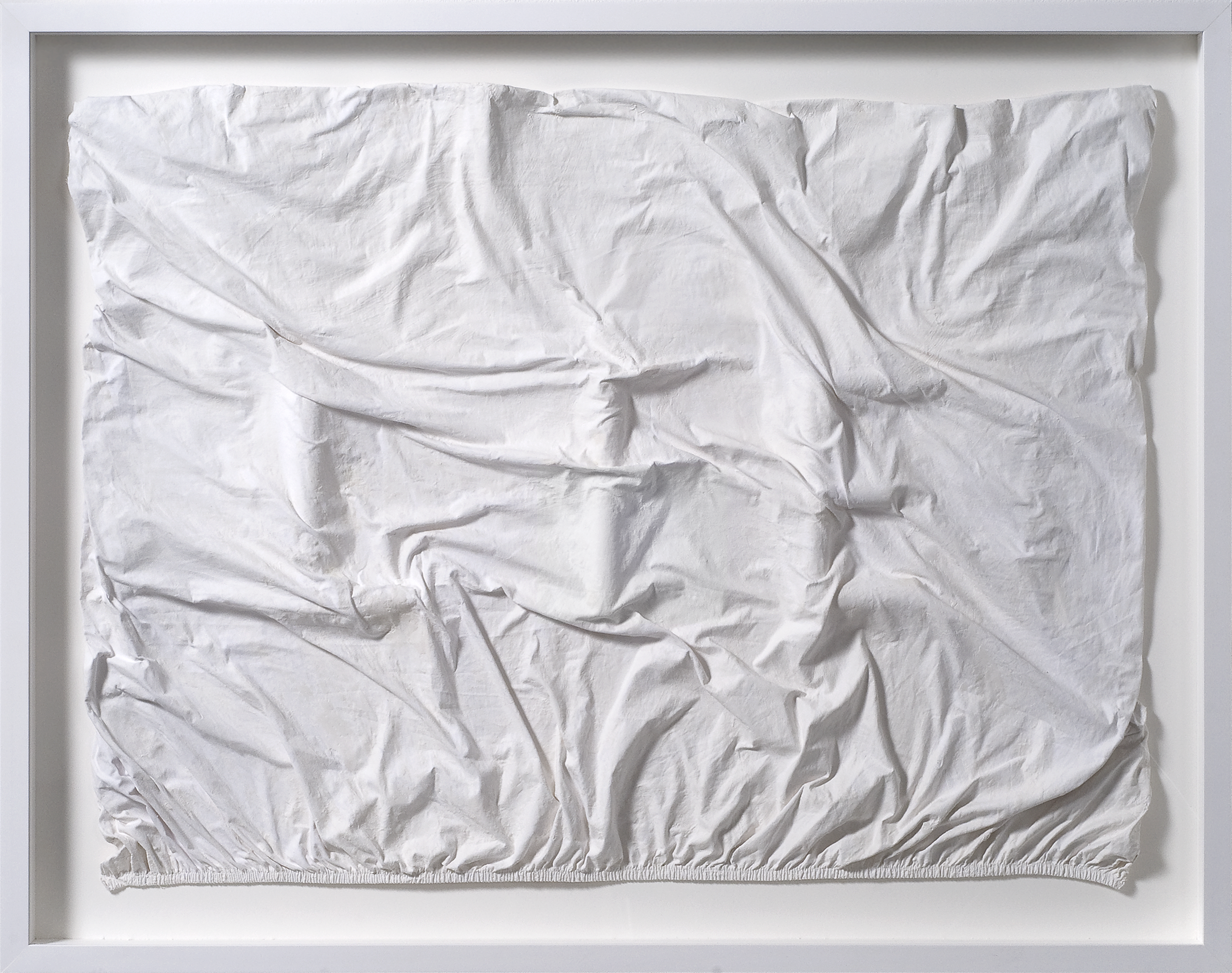 The bed is a symbol for the innocence of sleep, the sacredness of marriage, and sex and infidelity. In this relief sculpture, the word "lie" emerges from within the folds of a bedsheet. In this context, lie could refer to lying in bed, telling a lie, trying to cover up a lie, or a combination thereof. The word's obscured meaning is reflected in this sculpted image of letters partially veiled under a wrinkled fitted sheet, which is mostly relaxed and flaccid but also hints at tension where the fabric along the elastic band is itself under tension.