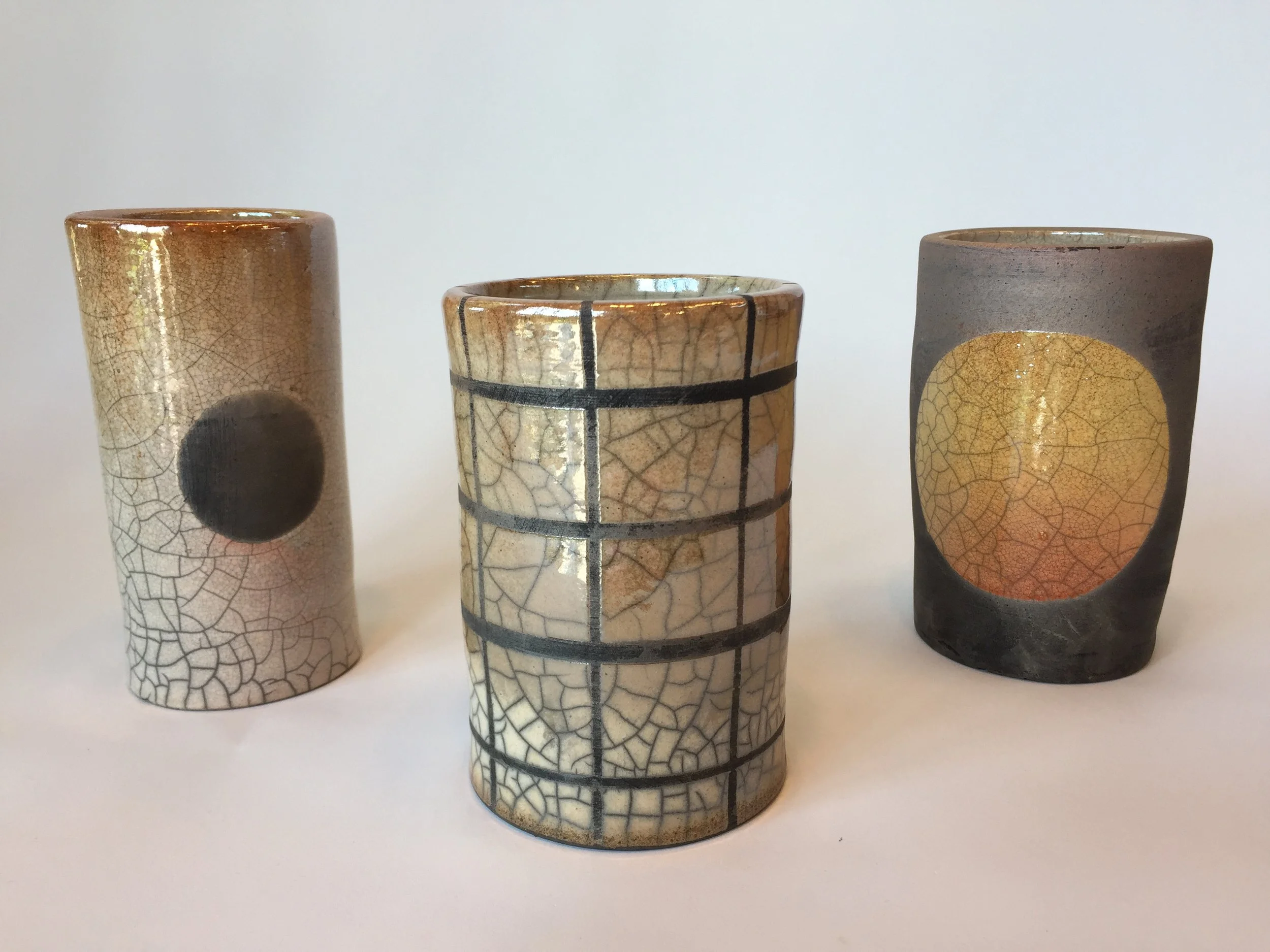 These ceramic cups, literally made of scorched earth, are decorated with simple geometric shapes and a texture reminiscent of dry, cracked earth. In the context of this texture, a black circle suggests a deep hole or crater; a large yellow-orange circle conveys the sun's scorching heat; and a grid of thin black lines is reminiscent of a cage or fence. Together, the cups evoke images of treacherous terrain, extreme weather, and restricted movement.